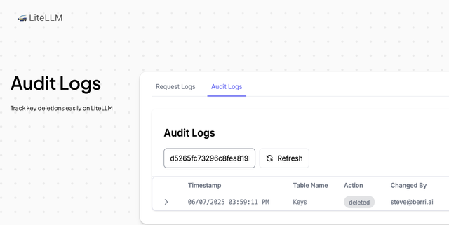 On the LiteLLM UI, navigate to Logs -> Audit Logs. You should see the audit log for the key deletion.
